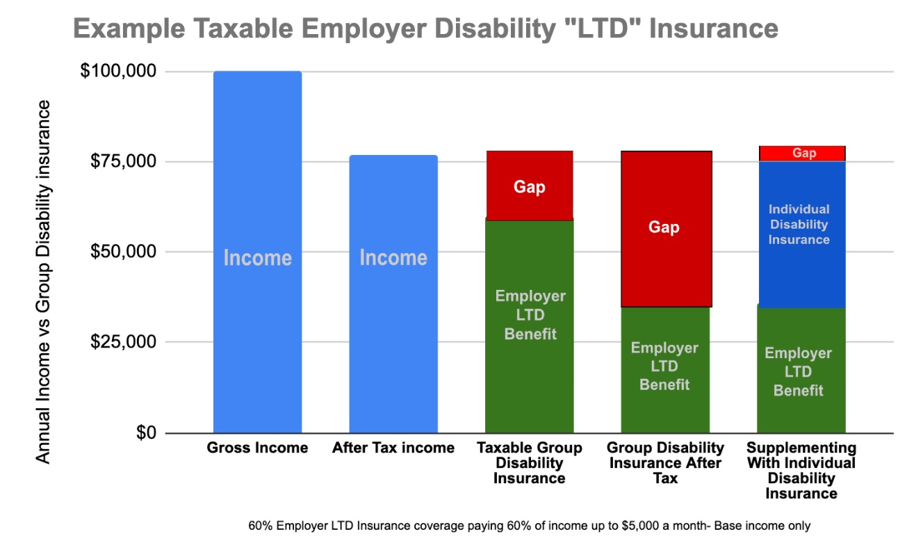 The chart above shows how taxable group LTD benefits actually pay out and the gap that appears once taxes hit. It’s a good reminder why many people choose to supplement group LTD with individual disability coverage to avoid that drop in take-home benefits.