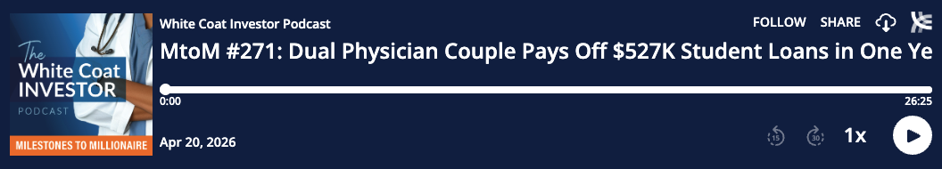 Well, very cool. Congratulations to both of you, Matthew and Casey. You've accomplished something that is very remarkable that will pay dividends for the rest of your life. Congratulations on figuring this stuff all out early and just taking those student loans in the corner and dropping an anvil on them. $527,000 in student loans out, your first year out of training. You should be very proud. Thank you for coming on and sharing your success with others to inspire them to do the same.