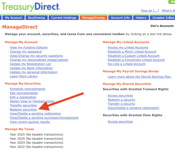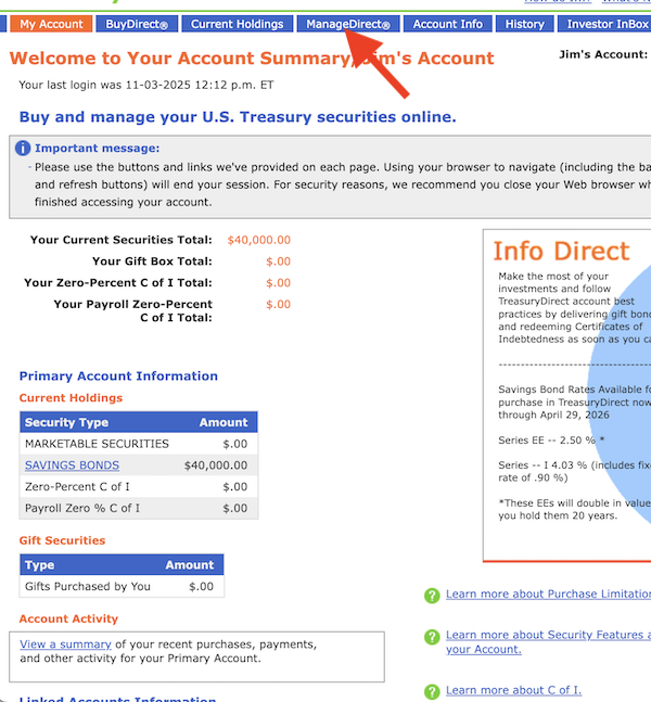 Log in to your TreasuryDirect account using your username, the “OTP” emailed to you, and your password. Your screen should look like this.