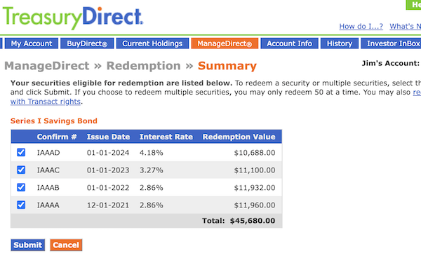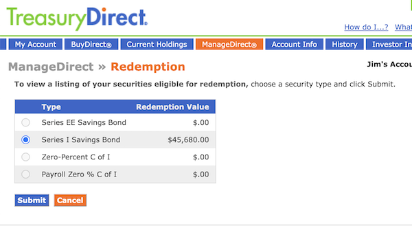 Click on what you want to sell—in this case, the I Bonds, which are all this account owned—and hit “Submit” and you go here: