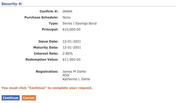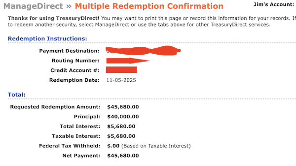 But you have to manage a separate account for each entity. And even when you add it all up, it still wasn't enough money to move the needle for us, so we decided to simplify. By dumping I Bonds and transferring the handful of individual TIPS owned in one of the TreasuryDirect accounts, we could close three financial accounts. The good news is that the dumping of the I Bonds is WAY easier and faster than the transfer of the TIPS to our Vanguard brokerage account. It took less than five minutes total to sell all the I Bonds across three different accounts. We'll just move that money into the TIPS ETF (SCHP) we use to keep the portfolio balanced.