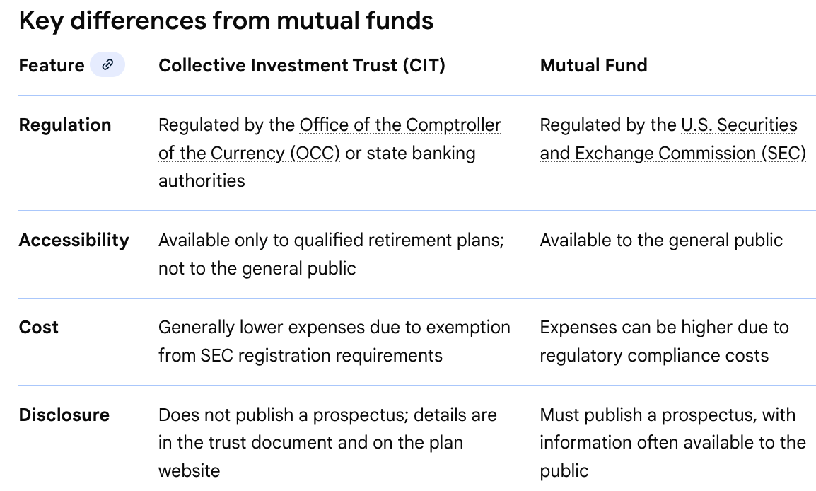 The second thing is that these funds will only be available in employer-sponsored plans like 401(k)s and 403(b)s. That seems kind of silly, so hopefully that's a temporary thing. The reason it's silly is that when people leave their employers to retire (i.e., the time when an immediate annuity of some kind actually makes sense), they usually roll their 401(k) or 403(b) money to an IRA to allow for more control, more investing options, and often lower fees. Now there's an option available in the 401(k) but not the IRA? What a pain. Perhaps the reason these funds will be a 401(k)-only option is because they are not actually mutual funds. They are Collective Investment Trusts (CITs). Here is an excerpt from a future WCI post on CITs, currently scheduled for publication in March 2026: