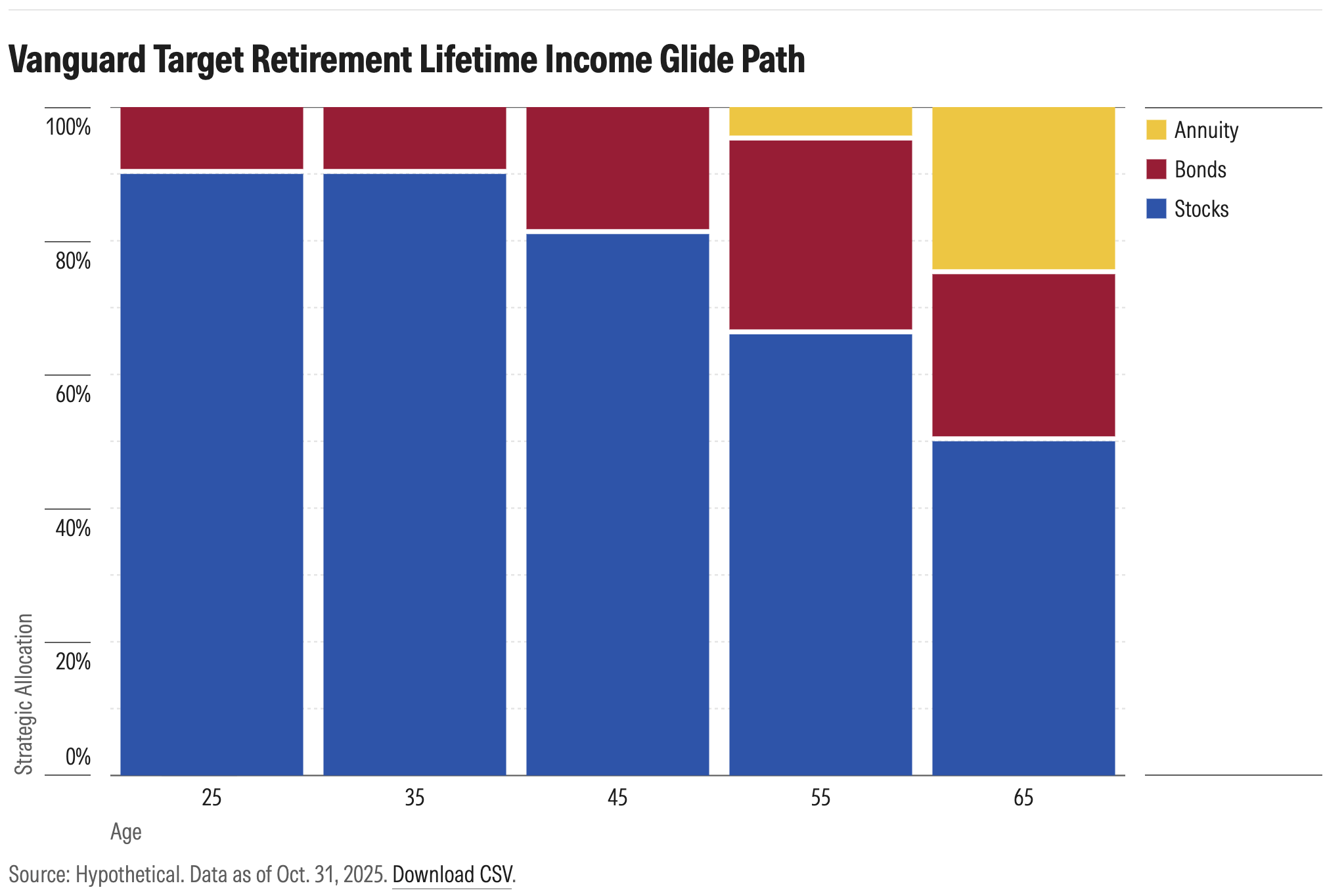 The plan for Vanguard is for these new target retirement funds to look like the older ones, at least until you hit the age of 55. Then, it'll start replacing some of the assets with an immediate annuity to provide more guaranteed income. Morningstar hypothesized that it would look like this: