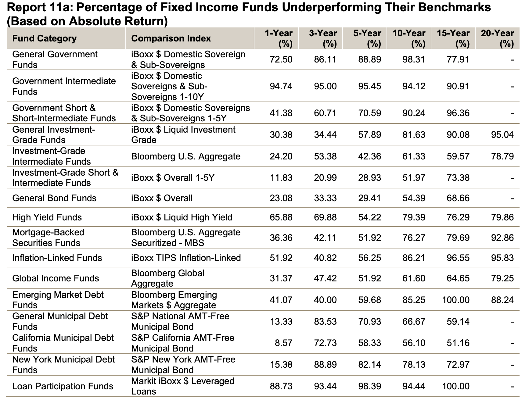Perhaps the greatest display of passive investing benefits comes from the semiannual SPIVA reports. Here's a chart from the most recent one when I wrote this post, but trust me when I say they all have looked pretty much the same for years and years.