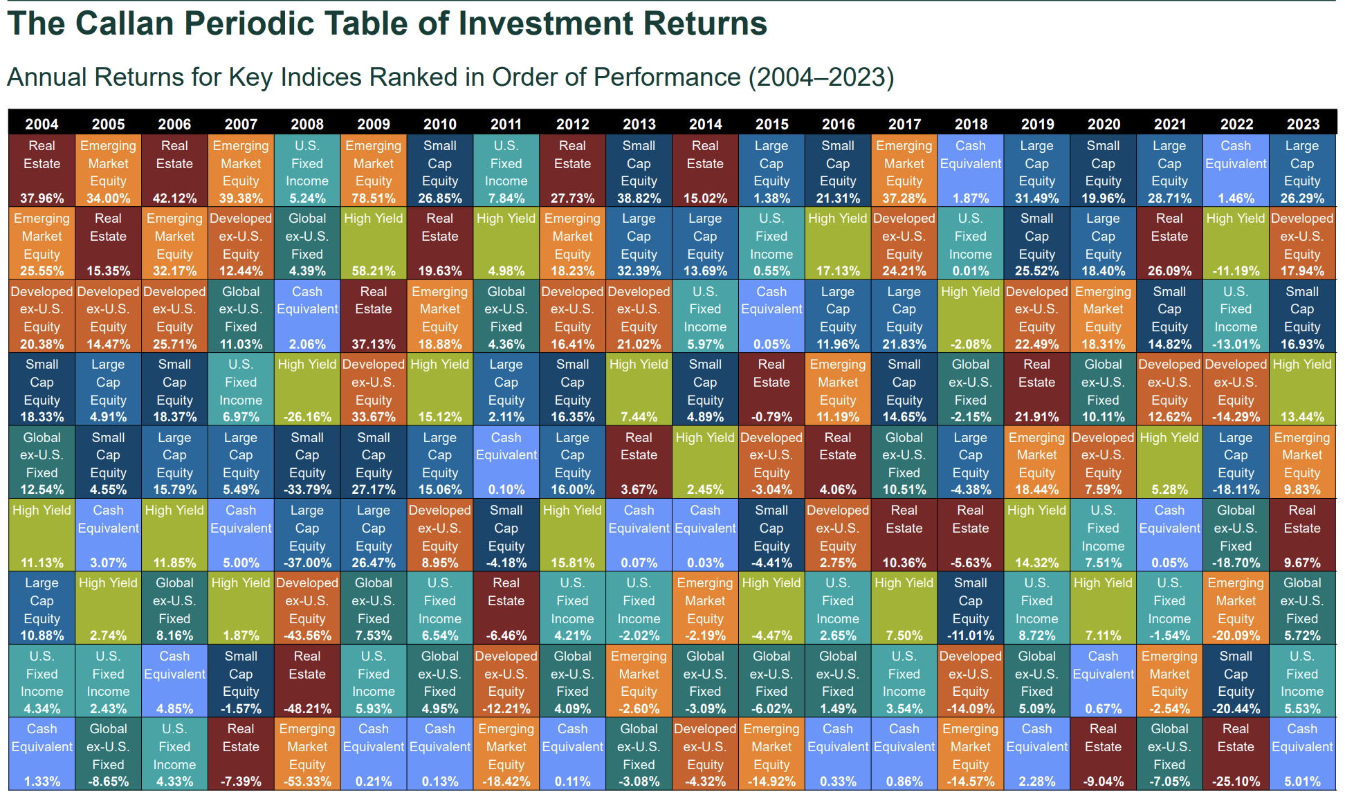 The lack of persistence year to year in relative investment returns is strikingly and memorably displayed. Imagine how disappointed you would be in 2008 if you had put all your money into emerging market stocks and real estate because they had the best returns for the prior three or four years? Or what if you put all your money into cash in early 2019 because stocks had done so poorly the month before? The pendulum swings, but if you chase it, you'll always be missing out on the best performers.