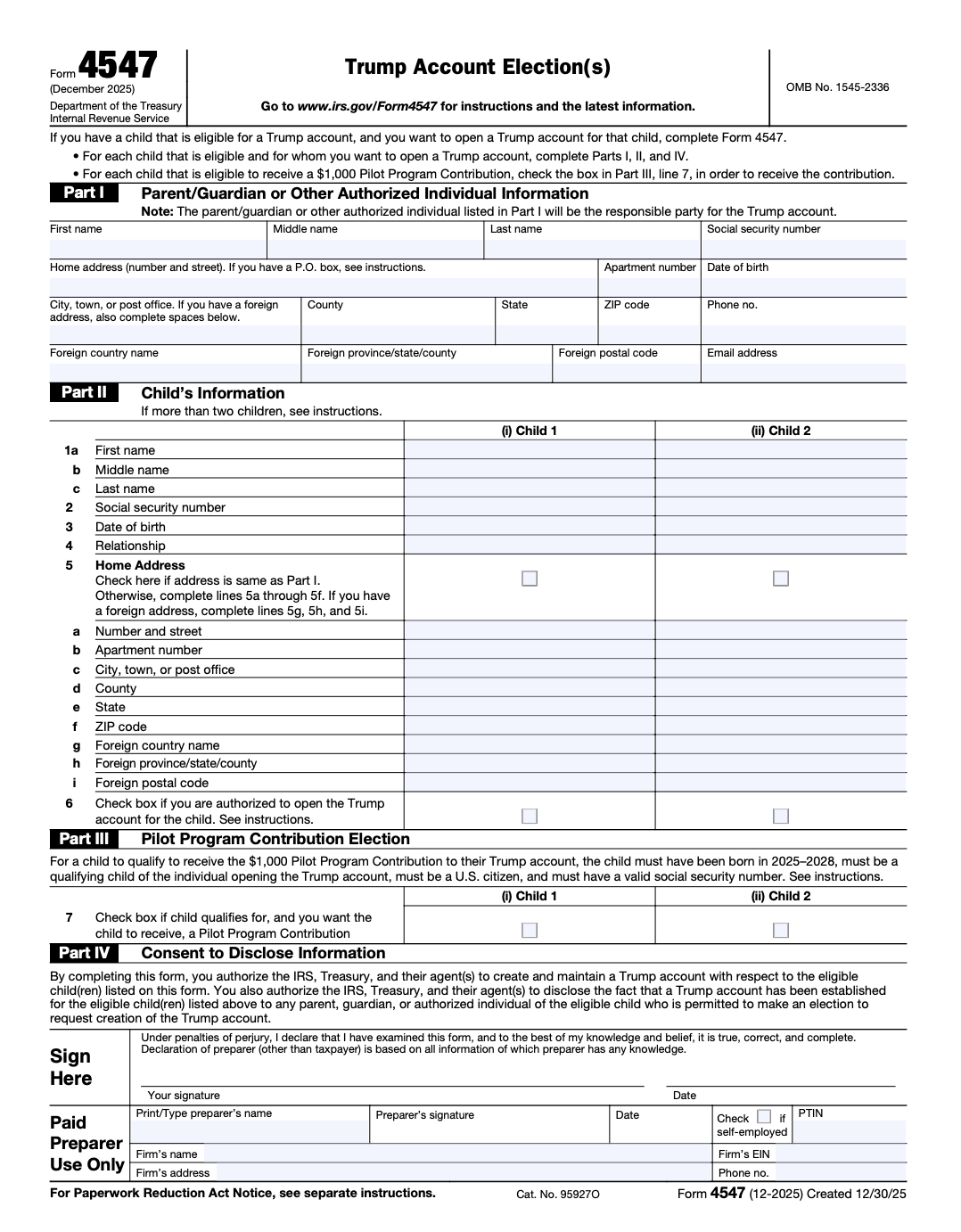 Even the instructions are only five pages long. And you only have to file this form once per kid. Be sure to check the box in Part III to get that $1,000 baby bonus money if you qualify for it, but you may have to fill out this form to open a 530A, whether or not your kid will qualify for the baby bonus money. I'm not really sure. Ask me in July after I open one for my kids. It wouldn't surprise me if there were an easy way provided to file this form AFTER you file your taxes (since it won't affect anyone's tax bill). If there is, you can learn about it at trumpaccounts.gov, and we'll try to update this post to include that information.